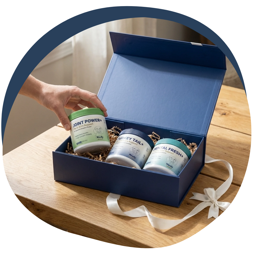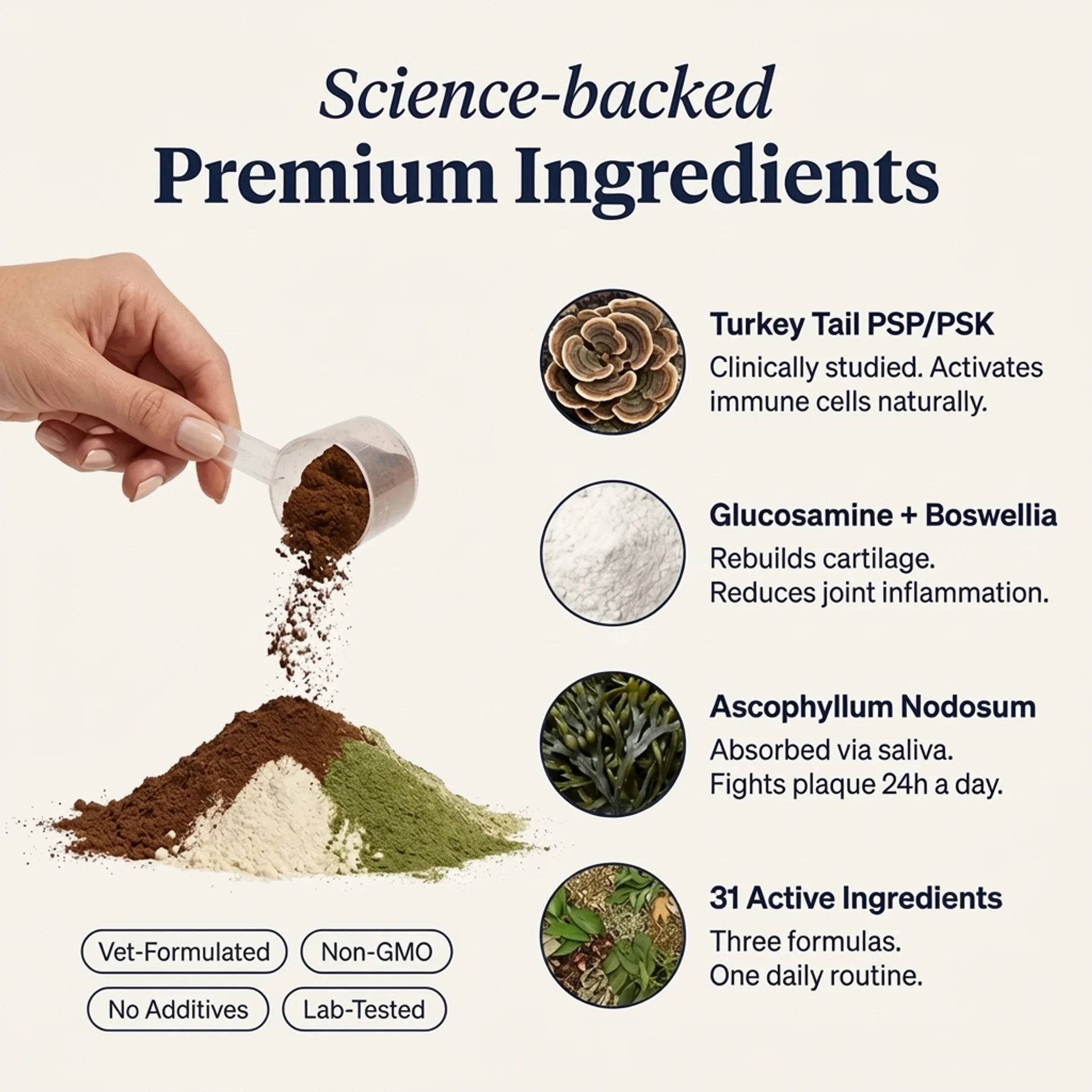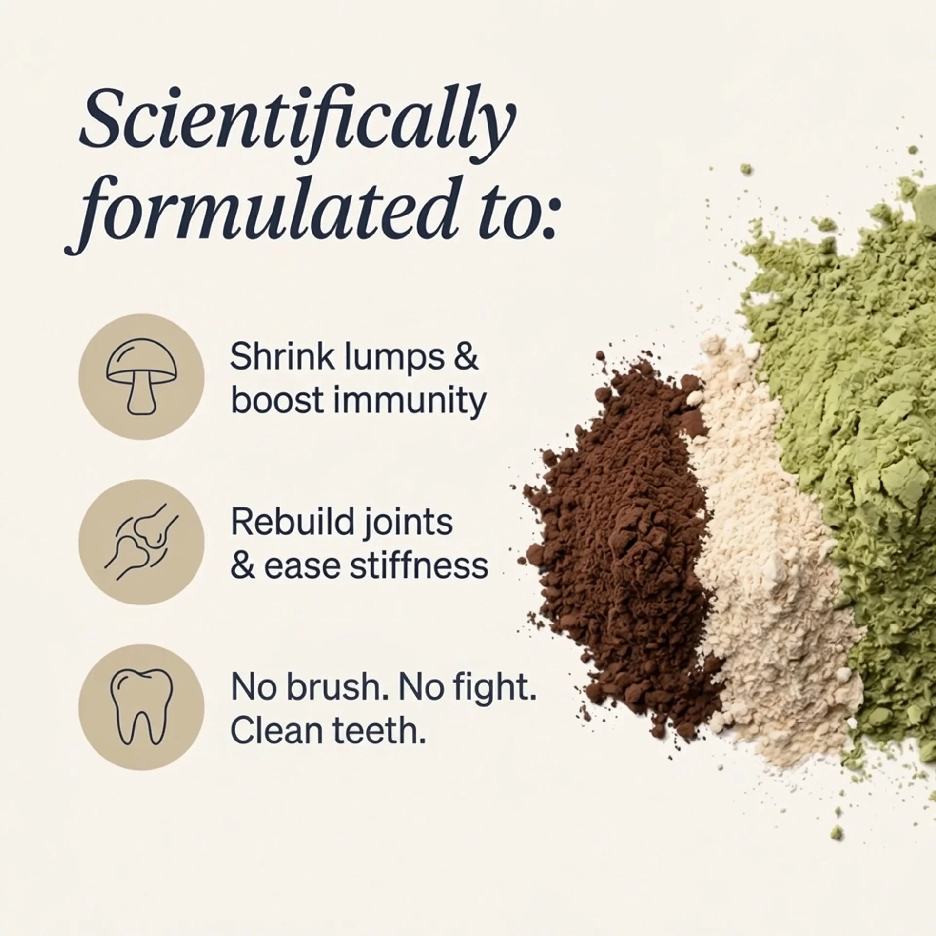Three vet-formulated powders. One for immunity, one for joints, one for oral health.