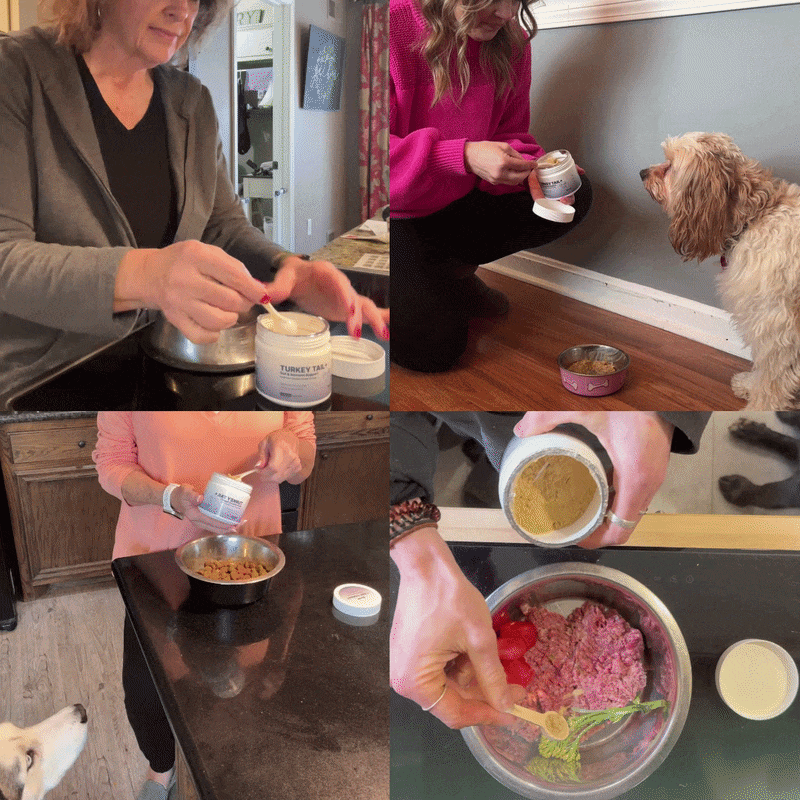 We recommend introducing each powder individually first. Start with one product for 5–7 days and make sure your dog tolerates it well before adding the next. Once all three are introduced separately, you can combine them — but ideally spread across meals if your dog eats twice a day. If your dog eats once daily, simply add all three scoops to the same bowl. Every dog is different — take it at their pace.