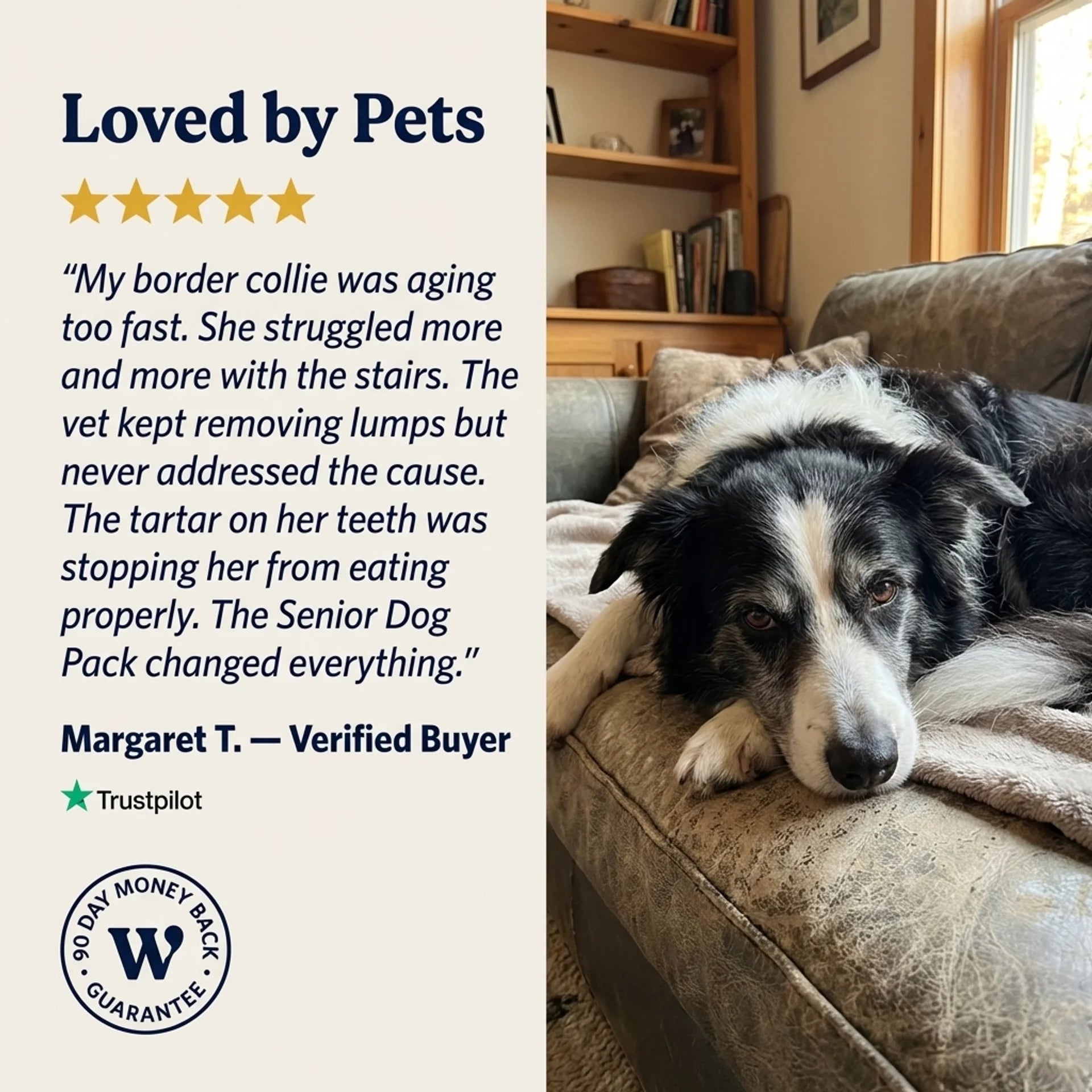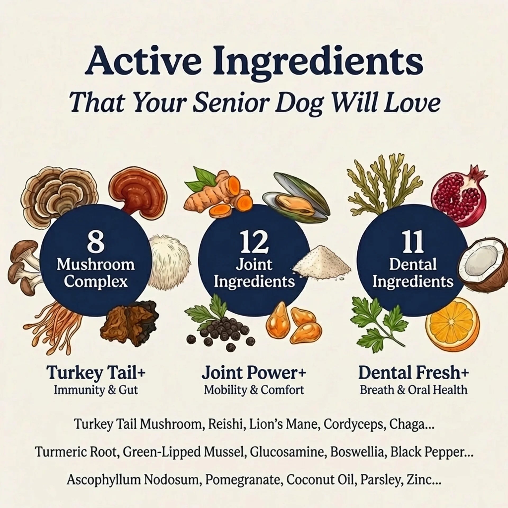 At 7+, your dog doesn't face one problem: they face all three at once. Joints that stiffen overnight. An immune system that can't fight what it used to. Teeth and gums quietly deteriorating between vet visits.