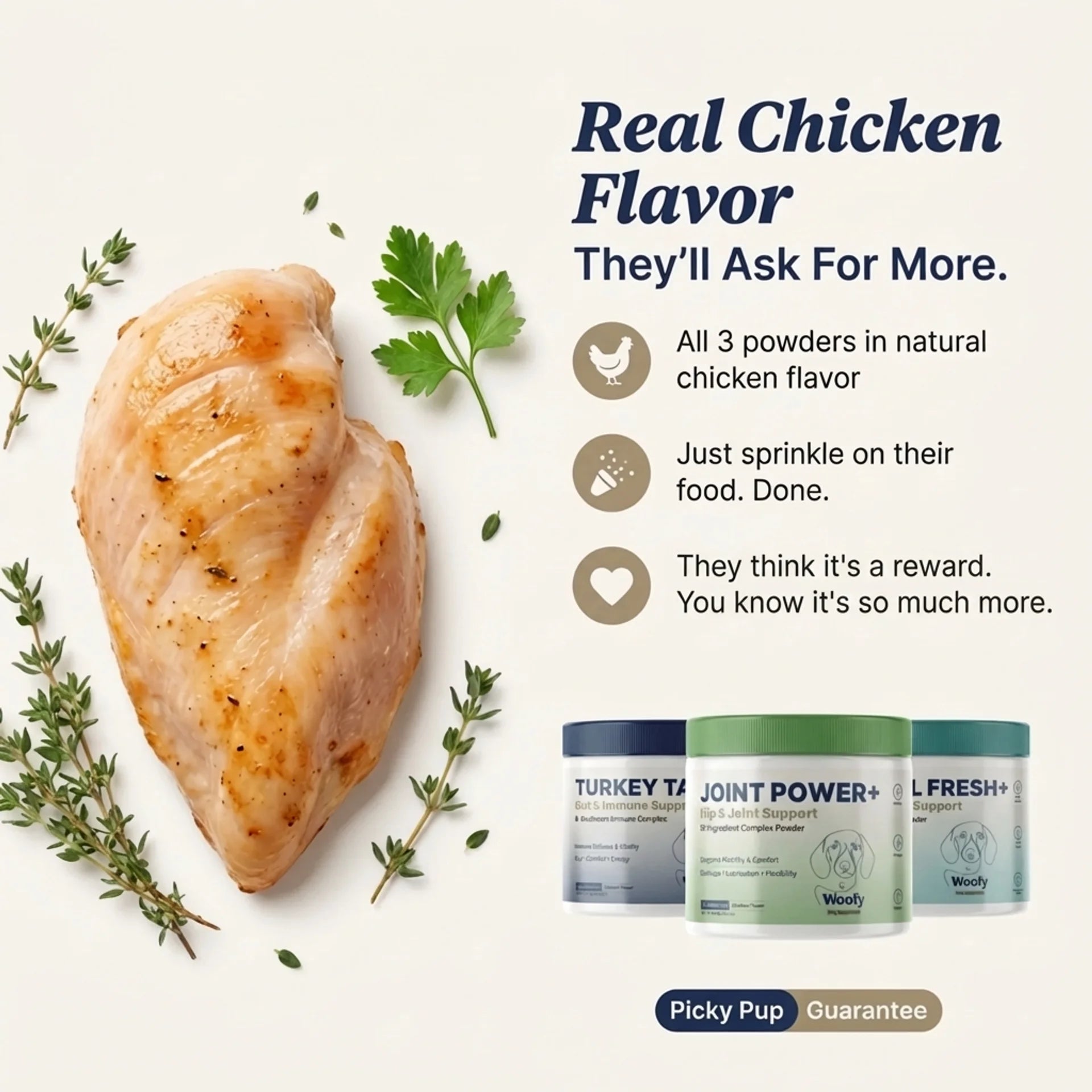 All 3 powders are real chicken flavor. They think it's a treat. If your dog disagrees — full refund, no questions asked. That's our Picky Pup Guarantee.