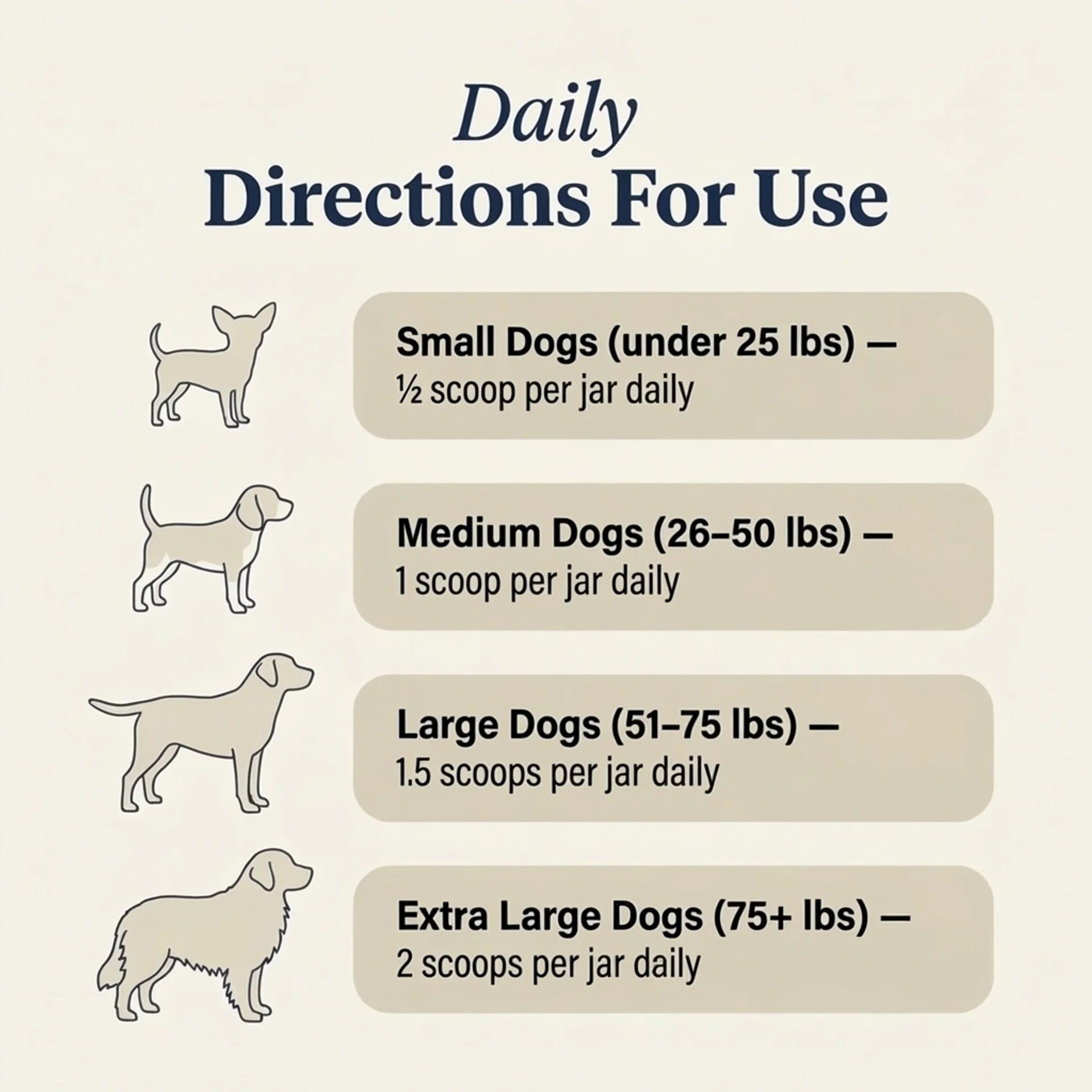 Dosage: ½ scoop (<25 lbs) · 1 scoop (25–50 lbs) · 1.5 scoops (51–75 lbs) · 2 scoops (75+ lbs)
